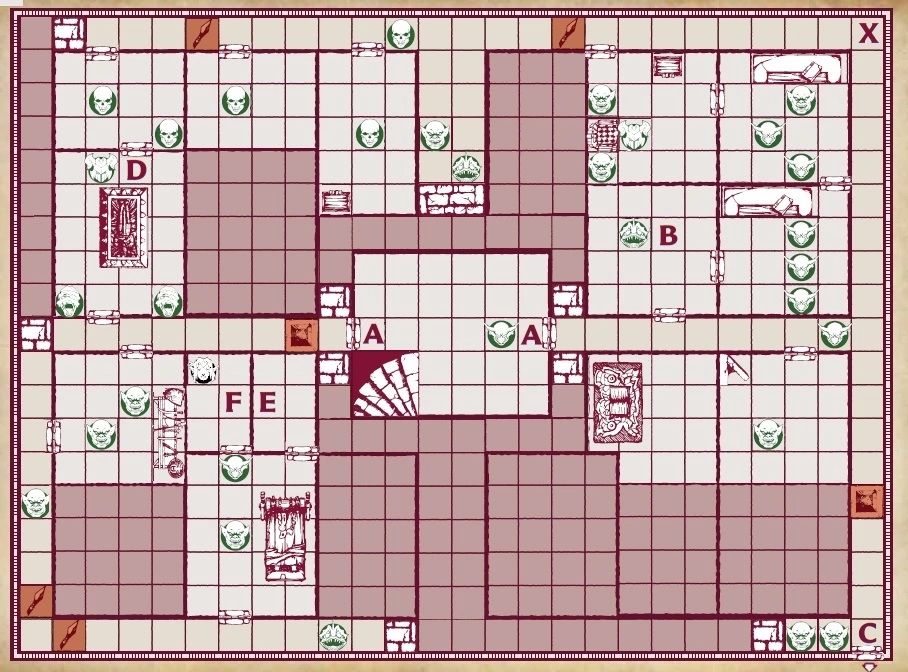 F. The cell to the left holds the Elvenprince. Use the Elf character to represent him. The Elvenprince has the same stats as the Elf in the main game, although he cannot cast spells and no monsters should attempt to attack him. He is moved as an additional character by whichever Hero has rescued him during their turn. When crossing the square marked X a sudden mist of black fog will surround him, and the Elvenprince transforms into – THE NECROMANCER! At this point you should replace the Elf with the Sorcerer and use the updated stats below. The Necromancer is now controlled by Zargon. He is powerful beyond the reckoning even of the great Gandalf, and cannot be killed: each time his body points reach zero he is resurrected at the Elvenprince’s cell. The quest is complete once all surviving Heroes escape through Door C.